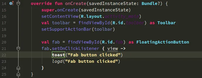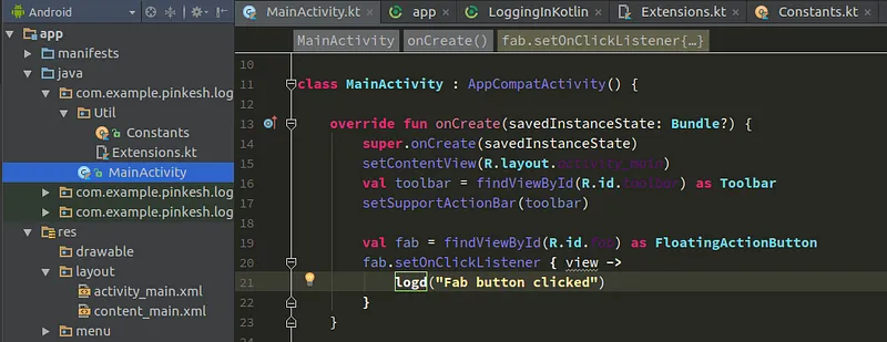 To create an extension function, put the name of the class that you want to extend then put a dot (.) and then name of your function. In the above code, we are creating the extension function for Activity that will log the messages. And, that’s it! We created an extension function.