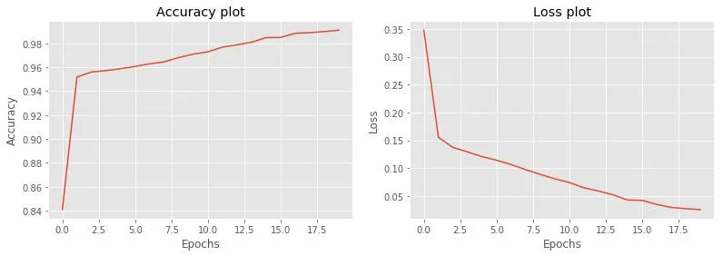 This gives an accuracy of 99.11% at the end of 20 epochs. And gives a test accuracy of 96.11% which is really good. Let’s plot the graphs of accuracy and loss over time.